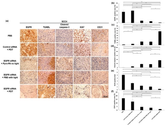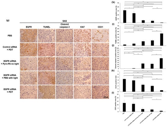 The following assays were conducted on SCC4 or SAS tumors for the EGFR marker: Ki67 marker was used for cell proliferation staining; CD31 marker was used for microvessel formation; cleaved caspase-3 was used to mark tumor cell apoptosis and TUNEL was used to stain DNA fragmentation. All of these assays were evaluated and quantified using immunohistochemistry staining (IHC) (Figure 7b–f,h–l). EGFR expression was observed at high levels with tumors of the PBS and LCP siControl+PDT groups, suggesting it was highly expressed in SCC4 and SAS cells. Both SCC4 and SAS tumors showed higher EGFR protein expression levels in the PBS and LCP siControl+PDT groups than in the three siEGFR-loaded LCP NPs groups. These three groups treated with LCP siEGFR nanoparticles showed lower EGFR protein expression (Figure 7b,h), which suggests that EGFR genes were silenced. This EGFR gene knockdown effect could lead to tumor cell apoptosis, DNA fragmentation, and reduced microvessel blood vessel formation, especially with the LCP siEGFR NPs+PDT combined therapy. For the LCP Pyro PA NPs–mediated PDT, LCP siEGFR, and both combined treatments groups, there were increased caspase-3 levels, representing apoptotic cells. Significant differences in the expression of TUNEL positive cells and cleaved caspase-3 between all treatment groups compared to the PBS group (p < 0.01, p < 0.05) were found in both SCC4 and SAS xenograft models (Figure 7c,d,i,j). The combined LCP siEGFR+PDT group showed significantly drastic cell destruction effects that led to 55% and 40% cell apoptosis detected via TUNEL assay (Figure 7c,i) and 35% and 50% cleaved caspase-3 (Figure 7d,j) expression in SCC4 and SAS models, respectively. Moreover, the LCP siEGFR+LCP-Pyro PA–mediated PDT showed a significant difference from LCP siControl+PDT, indicating that the LCP siEGFR NPs enhanced the apoptotic effect on cancer cells when combined with LCP Pyro PA–mediated PDT in SCC4 and SAS xenograft models. The quantified positive field of Ki67 cells indicated a stronger inhibition effect in the LCP siEGFR+PDT group compared to PBS, LCP siControl+PDT, LCP siEGFR+LCP Pyro PA without light, and LCP siEGFR+PBS+light groups (p < 0.01) for SCC4 (Figure 7e) and SAS (Figure 7k). This showed that the combination of LCP siEGFR NPs and LCP Pyro PA–mediated PDT enhanced the inhibition effect of the cell proliferation activity significantly. LCP siControl+PDT, LCP siEGFR+LCP-Pyro PA without light, and LCP siEGFR+PBS+light groups demonstrated significant inhibition (p < 0.01) in Ki67 amounts compared to PBS group for SCC4 and SAS xenograft models, revealing that LCP-Pyro PA–mediated PDT alone or siEGFR-loaded LCP NPs alone contributed significantly decreasing tumor cell proliferation. The quantified CD31 microvessel intensities of SCC4 and SAS tumors (Figure 7f,l) showed a dramatic decrease in groups treated with LCP siEGFR NPs for SCC4 and SAS models compared with PBS group (p < 0.01 for both). These groups exhibited significant differences compared with the LCP siControl+PDT (p < 0.01) group, suggesting that LCP siEGFR NPs showed a positive impact on the inhibition of microvasculature formation of the HNSCC tumors.