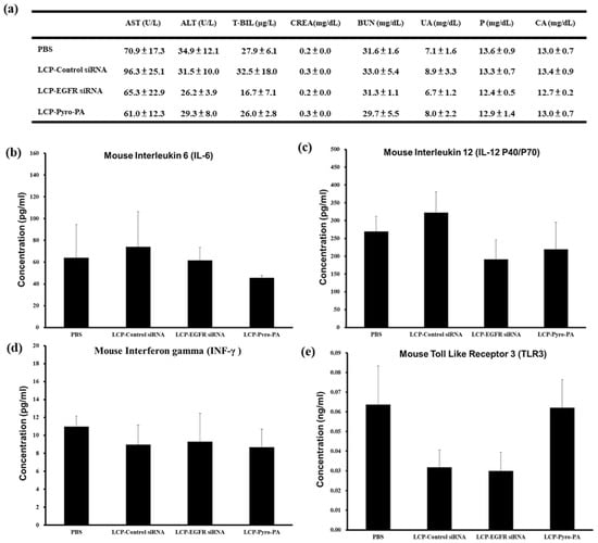 The siEGFR-loaded LCP NPs, siControl-loaded LCP NPs and LCP-Pyro PA NPs were investigated for liver and kidney toxicity. C57BL/6 mice were used for the studies. Twelve mice were distributed into four groups that were given three IV infusions of PBS, LCP Control siRNA NPs, LCP EGFR siRNA NPs and LCP-Pyro PA NPs for three days, one injection per day. Mice were sacrificed by cardiac puncture to collect the blood for assays on the fourth day. For liver function, there was no significant difference in aspartate aminotransferase (AST), alanine aminotransferase (ALT), and total-bilirubin (T-BIL) (p > 0.05) for LCP siControl, LCP siEGFR, and LCP Pyro PA groups compared to the PBS group. This suggests no liver function damage. Similarly in the kidney index, the creatinine (CREA), blood urea nitrogen (BUN), uric acid (UA), phosphorus (P), and calcium (CA) amounts indicated no significant effect (p > 0.05) (Figure 8a). No abnormal effect of LCP NPs on kidney function was noted, even though their cores are made of calcium phosphate. In Figure 8b–e, no significant difference was observed on the levels of interleukin 6 (IL-6), interleukin 12 (IL-12 P40/P70), interferon gamma (INF-γ), and Toll-like receptor 3 (TLR3) in triplicate (p > 0.05) for all groups (PBS, LCP siControl, LCP siEGFR, and LCP Pyro Pa). This further indicates no toxicity resulting from significant activation by LCP NPs of IL-6, IL-12, INF-γand TLR3 in mouse serum (p > 0.05). These in vivo toxicity assays suggest that both novel LCP Pyro PA NPs and LCP siRNA NPs are safe based on SCC4 and SAS animal model studies (Figure 8b–e).