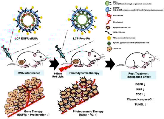Schematic illustration of LCP EGFR siRNA and LCP Pyro PA to xenograft models. We used SCC4 and SAS xenografts of Balb/c nude mice to verify the efficacy of the combination therapy. Combined therapy showed greater tumor growth inhibition for both SCC4 and SAS.