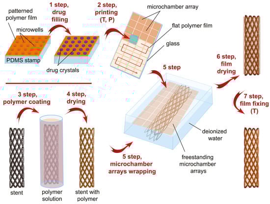 We immersed the nitinol stent in a 1.5 wt% PLGA solution for uniform coating (3rd step, Figure 1); then, the stent was dried in a jet of compressed air to remove excess polymer and avoid film formation between the wires. To detach the hydrophobic film of the microchamber array from the glass surface, we immersed the glass with the film in deionized water for 2 minutes. As a result, the straightened film with microchamber arrays floated on the water surface. We then submerged the PLGA-coated stent under the floating film and lifted it. As a result, the film evenly covered the stent with little overlap. Then, we gently dried the coated stent for 30 min at 37 °C. At the last—seventh step, the coated stent was placed in a sterile centrifuge tube (15 mL) and heated for 15 minutes at 55 °C. Chloroform evaporates more actively from polymers with increasing temperature, the viscosity of the polymer increases with temperature, and heat shrinkage helps the film adhere more tightly to the PLGA-coated nitinol. The proposed method makes it possible to securely and evenly fix the film on the nitinol stent, ensuring the load distribution on the polymer coating over the entire stent area.