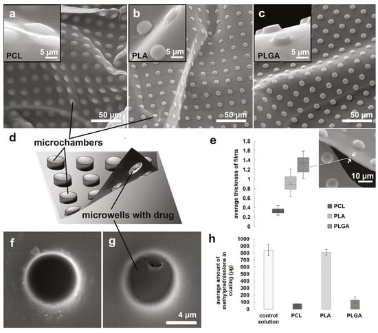 SEM images of the outer surface of microchamber arrays based on PCL (a), PLA (b), and PLGA (c). General scheme of microchamber array structure (d). The average thickness of microchamber array films based on PCL, PLA, PLGA (e). The inner surface of the empty (f) and filled with methylprednisolone sodium succinate (g) microwells. The average amount of methylprednisolone measured with GC-MS in the stent coating based on PCL, PLA, and PLGA (h).