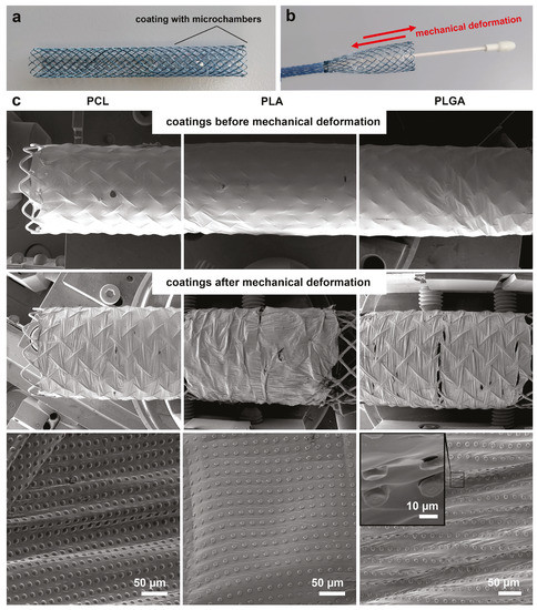 Typical photo of the stent with a coating based on microchamber arrays before (a) and after deformation in a delivery system (b). Stent size, 60 × 8 mm. SEM images of the stent with microchamber arrays based on PCL, PLA, and PLGA before and after deformation in a delivery system (c).