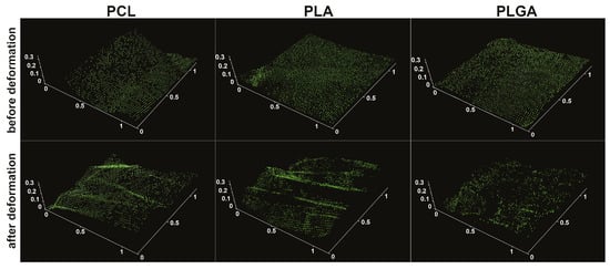 SEM showed that PLGA-based films biodegraded almost completely 10 days after implantation into the rabbit trachea (Figure 6). The degradation of PLA-based film was less pronounced, although individual chambers were well visualized in the remaining areas of the film. The PCL-based film did not change its morphological state significantly. Long-term degradation of the PCL-based film on the stent can cause the aggravation of the inflammatory process—the reason for granulation tissue overgrowing by blocking the outflow of fluid from the tracheal mucosa []. Fluid accumulation is a favorable environment for bacterial colonization and biofilm formation, which is a typical problem with any type of implant [].