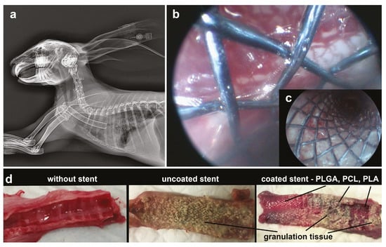 Stent placement is a standard and often the only way for treating airway obstructions (for instance, malacia, fistula [], and oncology) in clinical and veterinary practice []. Mainly, there are two types of stents used: covered (silicone, metallic, hybrid stents—metallic with silicone coating) and uncovered (expandable metallic) stents [,,]. Covered stents block proliferation granulation or tumor tissue through the stent, but the cover hampers expectoration of sputum. The accumulation of sputum between the stent and the trachea is a favorable environment of respiratory infection increase [] and often accompanied by pneumonia, up to the removal of the lung or death []. Uncovered expandable metallic stents do not contribute to such pronounced accumulation of sputum; however, they allow granulation tissue to proliferate within the stent, contribute to restenosis up to complete blockage of the stent lumen [,].