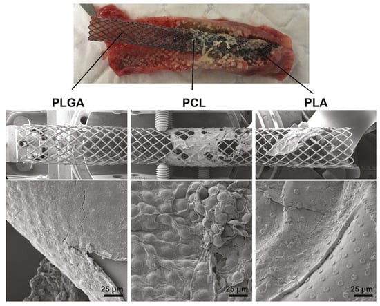 Biodegradation of PLGA, PCL, and PLA-based coatings 10 days after stent implantation in rabbit trachea. Photo of the trachea with a stent on top, SEM images of the coatings on the bottom.