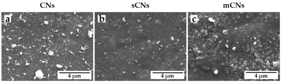 SEM micrographs of electrosprayed CNs from different sources: (a) CNs (from crustaceans by Texol s.r.l.); (b) sCNs (from shrimps, by Celabor s.c.r.l.); and (c) mCNs (from mushroom by Celabor s.c.r.l.). Scale bar: 4 μm, high voltage (HV) 10 kV, magnification 30,000×.