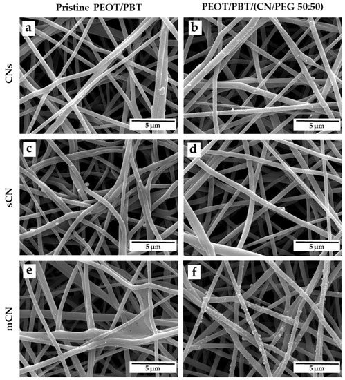 To have a mechanically reliable nanocomposites, a CN/PEG 50% (w/w %) pre-composite was chosen, having 2% CNs with respect to the copolymer weight (w/w %). This choice was derived from previous studies reporting on a viscosity mismatch between the two components in the melt, in particular using PLA [24,37,38]. In general, a number of CN/polymer nanocomposites, produced and processed from the molten state, have revealed improved mechanical properties along with anti-inflammatory and antimicrobial activity [24,39,40,41]. Some studies have reported on the feasibility of electrospinning CN/polymer nanocomposites, for example using CN/chitosan or CN/PCL solutions [42,43]. In fact, many parameters affect the electrospinning process [44], and the addition of CNs may vary the solution concentration, as well as the interaction with the electric field. Here, in line with other studies, which have widely demonstrated the electro-spinnability of pristine PEOT/PBT [6,8,10], we also showed that its nanocomposite PEOT/PBT/(CN/PEG 50:50) was successfully electrospun into ultrafine fibers.