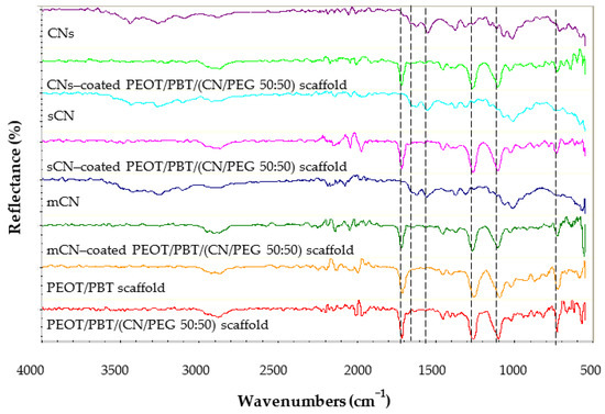 Figure 3 shows the FTIR spectra of pristine CNs from different sources, PEOT/PBT electrospun scaffolds, PEOT/PBT/(CN/PEG 50:50) electrospun scaffolds and the scaffolds functionalized with different types of electrosprayed CN. The main characteristic bands of CN were observed on the PEOT/PBT/(CN/PEG 50:50) scaffolds functionalized with electrosprayed CNs from different sources. These observations confirmed the presence of CNs on the scaffold surfaces. The main characteristic bands of PEOT/PBT can be also observed on the surface of scaffolds coated with electrosprayed CNs. The obtained results demonstrated that the solvent system did not affect CN structure.