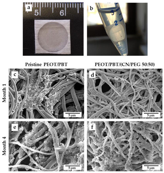 Degradation test of PEOT/PBT and PEOT/PBT/(CN/PEG 50:50) in an otitis-simulating fluid: (a,b) real size TM scaffold placed in the fluid at month 0; (c–f) SEM micrographs showing the fiber morphology of (c,e) PEOT/PBT, and (d,f) PEOT/PBT/(CN/PEG 50:50) meshes after (c,d) 1 month, and (e,f) 4 month incubation in the fluid. Scale bar: 5 μm, high voltage (HV) 10 kV, magnification 16,000×.