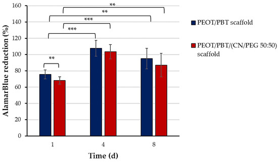 Bar graphs displaying the AlamarBlue® assay results, indicated as dye reduction percent, of hMSCs differentiated into fibroblasts for 8 days on PEOT/PBT and PEOT/PBT/(CN/PEG 50:50) scaffolds. Data are expressed as mean ± standard deviation (n = 3; ** p < 0.01; *** p < 0.001).