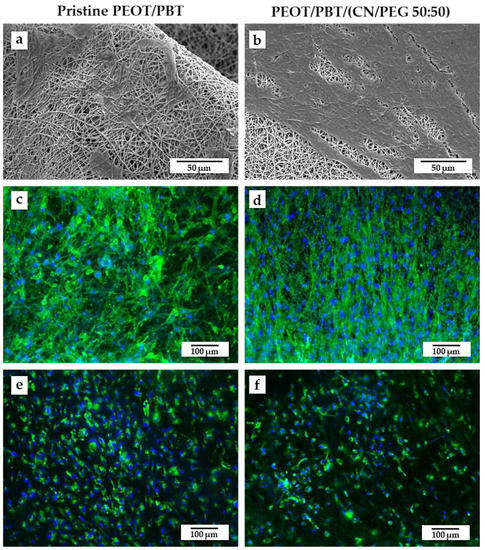 SEM micrographs of hMSCs differentiated into fibroblasts on (a,c,e) PEOT/PBT and (b,d,f) PEOT/PBT/(CN/PEG 50:50) scaffolds: (a,b) SEM micrographs imaging elongated cells adhered on the surface of the fiber meshes. Scale bar: 50 μm, high voltage (HV) 10 kV, magnification 1600×; (c,d) fluorescence micrographs revealing f-actin with phalloidin (green) and cell nuclei with DAPI (blue) staining; and fluorescence micrographs revealing collagen type I (green) immunofluorescence and DAPI (blue) staining. Scale bar: 100 μm, original magnification 100×.