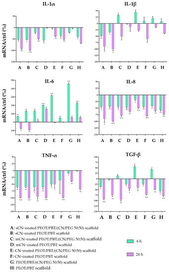 Figure 7 shows the results of quantitative RT-PCR related to different cytokines involved in the inflammatory response of HaCaT cells after 6 h and 24 h of exposure to PEOT/PBT and PEOT/PBT/(CN/PEG 50:50) electrospun scaffolds coated with electrosprayed CNs from different sources, namely, crustacean (i.e., CNs), shrimp (i.e., sCNs) and mushroom (i.e., mCNs).