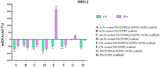 We also investigated indirect antimicrobial activity in terms of mRNA expression of the HBD-2 at 6 h and 24 h. The outcomes, reported in Figure 8, showed that HBD-2 was slightly downregulated with respect to the basal conditions of HaCaT cells by all the treatments (range: 40–60%), but CN (from crustaceans) electrosprayed CN/PEG (50:50) nanocomposite scaffolds, which interestingly upregulated HBD-2 expression to 210% at 24 h. Additionally, the nanocomposite itself, produced using the same type of CNs was able to increase the HBD-2 gene expression by 30%. All in all, while the coatings with sCN and mCN negatively affected HBD-2 expression, CNs showed a significant indirect antimicrobial activity in combinations with PEOT/PBT/(CN/PEG 50:50) fiber scaffolds.