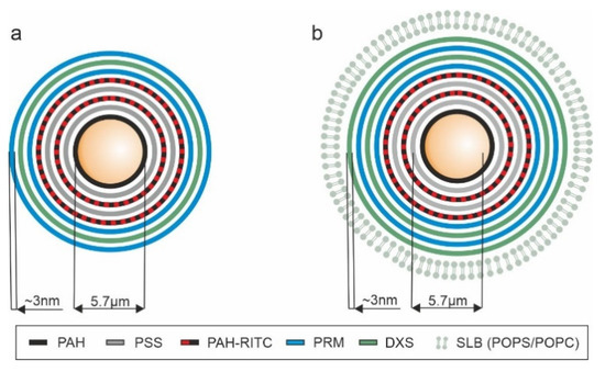 LbL microcarriers with identical multilayer composition, but different surface characteristics (polymer or lipid layer) were applied to the four human and animal cell lines and M1-like MΦ as outlined before. LbL microcarriers consisted of a multilayer of PAH (PAH-RITC) and PSS as inner and PRM and DXS as biopolymer outer part (Figure 1). Both polymer pairs (PAH/PSS, PRM/DXS) are built up as a regular step-by-step multilayer as previous zeta potential measurements reveal [32,33]. As a final surface coverage, the carriers either terminated with a negatively charged polymer layer (DXS, named as polymer microcarriers, Figure 1a) or with a SLB (hereafter referred to as SLB microcarriers, Figure 1b). The main components of the lipid bilayer of SLB microcarriers consisted of zwitterionic phosphatidylcholine (POPC) and anionic phosphatidylserine (POPS) at equal molar ratios resulting in a negatively charged layer, the PE-PEG-biotin component, added at only 0.5 mol%, does not have an impact on the charge of the resulting lipid bilayer [25]. Thus, PRM was additionally assembled as an underlying layer of the SLB coating. With dominating micrometre-scaled core size, LbL microcarriers of the same size and surface charge were created to provide comparable conditions regarding cellular interaction, such that the subsequent investigations of uptake, intracellular pathway and cell metabolism only depend on the different surface functionalisation with a negatively charged polymer or SLB layer.