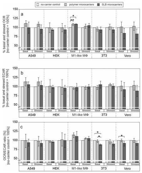 As can be observed for all applied cell lines (Figure 2 and Figure S1), the influence of both microcarrier types on mitochondrial respiration and glycolysis was generally rather low. However, cell type- and microcarrier functionalization-specific differences were noted. A significant increase in basal OCR after application of both microcarriers was only noted for M1-like MΦ (Figure 2a). This could be related to their function as a phagocytic cell type. M1-like MΦ are likely to take up microcarriers by phagocytosis, which represents a high energy-demanding process. This could result in the observed increase in OCR and thus in mitochondrial respiration. Vero cells were the only cell type for which a decrease in both OCR and ECAR occurred in comparison to the no-microcarrier control (Figure 2b). Moreover, this decrease was detected for both, basal and stressed ECAR by 7% and 11%, respectively. Additionally, the decrease in both, basal and stressed OCR was higher than the one detected in HEK and 3T3 cells (Figure 2). Except for human M1-like MΦ, after addition of SLB microcarriers a drop in basal OCR/ECAR ratio was noted for all cell lines (Figure 2c). Only Vero and 3T3 cells were positive for a significant drop in both, basal and stressed OCR/ECAR ratio.