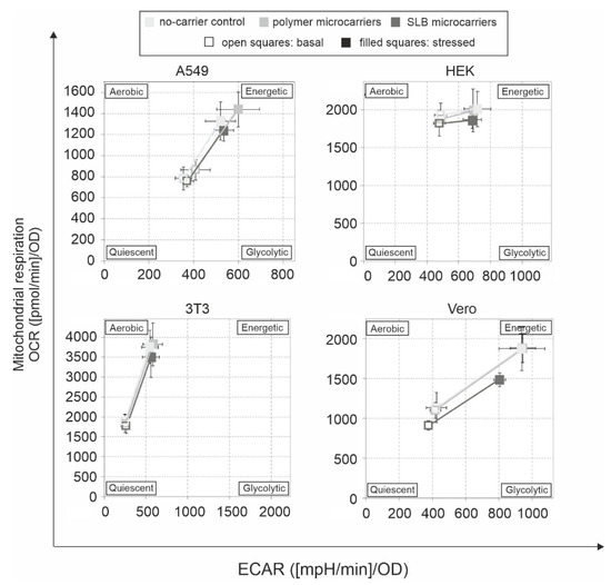 Cell energy phenotype for all examined cell lines incubated in the presence and absence of microcarriers. Energy maps were generated by the cell energy phenotype test kit based on OCR vs ECAR values obtained under basal and stressed conditions to reveal changes in energy maps after application of polymer and SLB microcarriers.