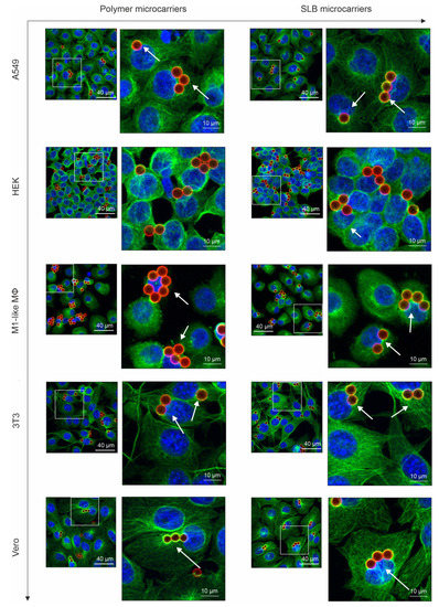 The association of microcarriers with microtubule filaments and their localization in a perinuclear area in different human and animal cell types and M1-like MΦ. Immunofluorescence analysis was performed after incubation of indicated cell types with polymer and SLB microcarriers for 16 h. The images were obtained after maximum intensity projections and the overlays show nuclei in blue (counterstained with DAPI), microtubule filaments in green (application of anti-α-tubulin antibodies) and microcarriers in red (labelling with RITC). The insets depict a higher magnification of indicated areas to reveal association of microcarriers with microtubule filaments (indicated by white arrows). Image size of the unzoomed images: 145 µm × 145 µm, zoom-ins: 58 µm × 58 µm.