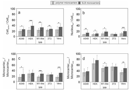 First, the ratio of cells with at least one internalized carrier indicative for microcarrier uptake (Celluptake) and total cell number (Celltotal) was determined (Celluptake/Celltotal). This parameter reflects an estimate of the uptake capacity of the respective cell type. Figure 5a shows in comparison to polymer microcarriers a significantly higher internalization rate of SLB microcarriers on all five examined cell types. This indicates a cell line- and cell type-independent positive influence of lipid bilayer-based surface on the uptake of microcarriers. The highest uptake rate was achieved for SLB microcarriers on HEK cells (Figure 5a). Second, the ratio of cells with at least one microcarrier-induced nuclear deformation (Nucleusdef) and total cell number (Celltotal) was determined (Nucleusdef/Celltotal). Except for 3T3 cells, SLB microcarriers induced a significantly higher portion of deformed nuclei than polymer microcarriers (Figure 5b). The comparison of the five cell types indicates the highest level of deformed nuclei in M1-like MΦ and Vero cells. Third, the influence of the lipid bilayer-based surface on nuclear deformation events is especially indicated by the calculation of the ratio of internalized microcarriers which are involved in nuclei deformation (Microcarrierdef) and the total carrier number in cells (Microcarriertotal), the (Microcarrierdef/Microcarriertotal) ratio. On A549, M1-like MΦ and Vero cells the proportion of microcarrier-associated nuclear deformation events in comparison to total uptake events was significantly higher for SLB microcarriers in comparison to polymer microcarriers (Figure 5c). Fourth, the ratio of nucleus-near microcarriers (Microcarriernucleus) compared to all internalized microcarriers (Microcarriertotal), the (Microcarriernucleus/Microcarriertotal) ratio, was different within cell types, being the highest in HEK and the lowest in A549 cells (Figure 5d). Except for A549 cells, the Microcarriernucleus/Microcarriertotal ratio was higher than the Microcarrierdef/Microcarriertotal on the examined cell types. Thus, on A549 cells almost all microcarriers present in a perinuclear region result in nuclear deformation (Figure 5d). The lowest number of nuclear deformation events in relation to nuclear co-localization events was present in 3T3 cells (Figure 5d).