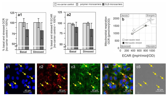 Influence of polymer and SLB microcarriers on mitochondrial respiration and glycolysis. The metabolic phenotype of the indicated cell lines was determined by extracellular flux analysis using the cell energy phenotype test kit. Basal and stressed (a) OCR and (b) ECAR values in addition to OCR/ECAR ratio (c) were obtained before and after injection of the inhibitors FCCP and oligomycin, respectively. Results are shown as percent change in relation to the untreated (no-microcarrier) control. The metabolic potential under basal and stressed (after injection of the inhibitors) conditions was calculated for indicated cell lines by the Energy Phenotype Test report generator software (n = 3, one-way ANOVA and Tukey’s post-hoc, * p < 0.05, ** p < 0.01).