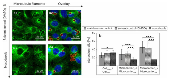 Immunofluorescence analysis of microtubule filaments in Vero cells after 4 h of incubation with SLB microcarriers and nocodazole (NOC). The solvent control (DMSO, a1,a2) or nocodazole (a3,a4) were added together with SLB microcarriers to Vero cells followed by replacement to maintenance medium after 4 h of incubation followed by an additional incubation time of 2 h. Nuclei were stained with DAPI (blue), microtubule filaments with anti-α-tubulin (green), and microcarriers with RITC (red). In (b) SLB microcarriers were added in maintenance medium (maintenance control), in the solvent control (solvent DMSO) or nocodazole medium to Vero cells. Immunofluorescence samples were subjected to quantification of cell and microcarrier properties. Data are presented as the ratio of cells with at least one internalized microcarrier to the total number of cells (Celluptake/Celltotal), the ratio of microcarrier-associated with deformed nuclei to total number of microcarriers (Microcarrierdef/Microcarriertotal, and the ratio of internalised microcarrier, which are associated with microtubule filaments (Microcarriertub/Microcarriertotal), (n = 3, five random microscopic fields were used for quantification t-test, * p < 0.05, *** p < 0.001). Image size: 75 µm × 75 µm.