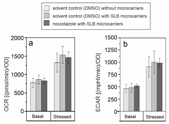 The effect of the microtubule polymerization inhibitor nocodazole on SLB microcarrier-associated metabolic alterations was then investigated through assessment of basal and stressed OCR and ECAR through application of the cell energy phenotype test kit. Figure 8 reveals a comparable impact of SLB microcarriers in the solvent control and SLB microcarriers in nocodazole on basal and stressed OCR (Figure 8a) and ECAR (Figure 8b) and as such on cellular metabolic activity.