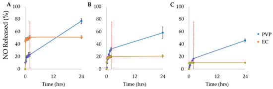 In vitro release of NO from NO-fibers fabricated with PVP or EC over 24 h. The percent NO released from NO-fibers containing PROLI–NONOates (A), DPTA–NONOates (B), and DETA–NONOates (C). Red lines indicate 2 h marks. Data are shown as mean ± standard deviation (SD).