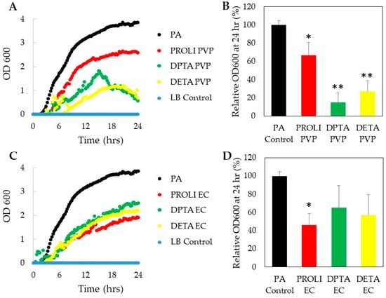 Antimicrobial effect of NO-fibers on P. aeruginosa, listed as PA. Growth curves of P. aeruginosa treated with PVP NO-fibers (A) and EC NO-fibers (C) over 24 h measured as optical density at 600 nm. The viability of P. aeruginosa at 24 h was compared to the untreated control following treatment with PVP NO-fibers (B) and EC NO-fibers (D). Data are shown as mean ± standard deviation (SD). n = 3 statistical significance: * p < 0.05, ** p < 0.01.