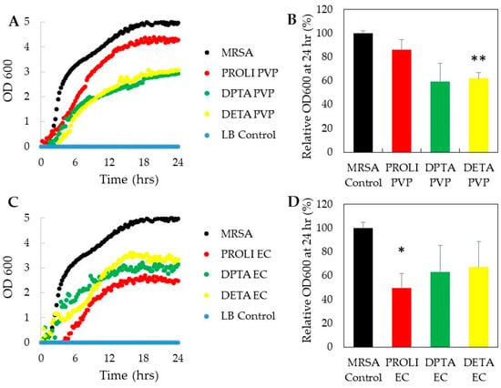 Antimicrobial effect of NO-fibers on MRSA. Growth curves of MRSA treated with PVP NO-fibers (A) and EC NO-fibers (C) over 24 h were measured as optical density at 600 nm. The viability of MRSA at 24 h was compared to the untreated control following treatment with PVP NO-fibers (B) and EC NO-fibers (D). Data are shown as mean ± SD. n = 3 statistical significance: * p < 0.05, ** p < 0.01.
