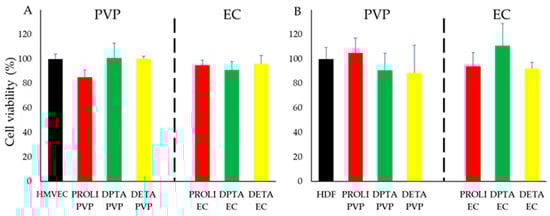 In vitro evaluation of the cytotoxic effect of NO-fibers on HMVEC and HDF cells. Cell viability was measured using alamarBlue assay after 24 h of incubation with PVP and EC NO-fibers. (A) Percent viability of HMVEC with respect to untreated HMVEC; (B) percent viability of HDF with respect to untreated HDF. Data are shown as mean ± SD.