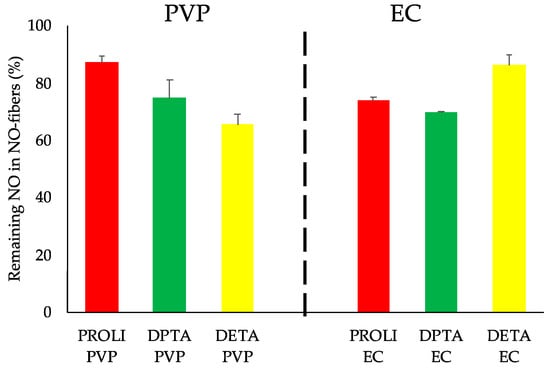 We evaluated the long-term stability of NONOates in NO-fibers by analyzing the total NO content. NO-fibers in a dry state were stored in sealed containers at room temperature for 12 months before the analyses. Using the colorimetric assay, we measured the total content of NO, and the obtained values were compared to the initial total content of NO (Equation (3)). The evaluation and comparison of NO content showed that NO-fibers retained at least 65% of NO-releasing NONOates after 12 months of storage (Figure 6). Among PVP NO-fibers, PROLI NO-fibers exhibited the greatest retention, with 87% of its initial NO content remaining. DPTA NO-fibers and DETA NO-fibers retained slightly less with 75% and 65% of their initial NO content, respectively. For EC NO-fibers, DETA EC exhibited the greatest storage capacity, maintaining 86% of its initial NO content, while PROLI EC maintained 74% and DPTA EC maintained 70%. At this point, we did not find any correlation between the NO release kinetics and the long-term stability of each NO-fiber. Additionally, no discernable differences in stability were noted between biopolymers or among NONOates.