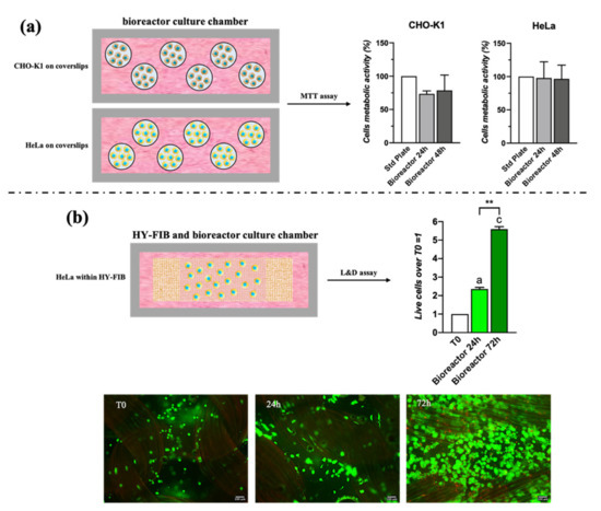 The cyclic strain bioreactor was specifically designed and 3D printed; therefore, before its use with human stem cells, its cytotoxicity was evaluated using CHO-K1 and HeLa cell lines. The study revealed that bioreactor vessel and elements did not affect cell metabolic activity, which was 80% for CHO-K1 cells and 100% for HeLa cells at 24 h and 48 h (Figure 1a). Cytotoxicity was also evaluated on the 3D scaffold bioengineered with 1 × 106 HeLa and maintained for 72 h in the bioreactor chamber under cyclic strain, set at 10% deformation and 1 Hz frequency. Live and Dead assay indicated cells proliferation with an increased green signal (live cells) of 2-fold after 24 h and 5.5-fold after 72 h of culture (Figure 1b).