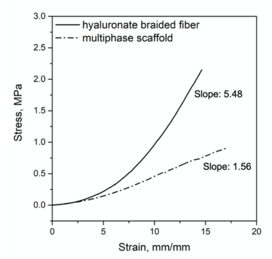 Mechanical characterization of the 3D scaffold. Stress–strain plot and elastic modulus values of hyaluronate braided band (continuous line) and of multiphase stem cell-based scaffold (dashed line).