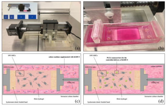 Under this strain force, two series of experiments were performed: (i) supplementing hGDF-5 in the external medium (Figure 3c) at 100 ng/mL and changing the medium every 4 days; and (ii) adding, into the fibrin hydrogel, PLGA carriers providing a controlled release of the growth factor within the 3D system (Figure 3d).