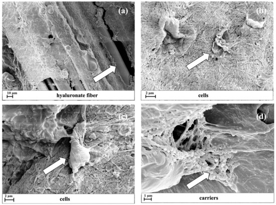 3D scaffold structure monitored by FE-SEM images after its assembly. FE-SEM images were reported with different enlargements to better describe: the hyaluronate fibers covered by the fibrin hydrogel (a); the cells (see arrowheads) entrapped within the fibrin matrix in large aggregates connected with fibrin network (b,c); NCs distributed within the fibrin network (d).