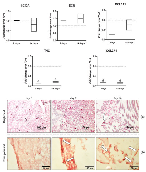 In the first experimental setting, hWJ-MSCs were seeded within the fibrin hydrogel of the scaffold and cultured, under dynamic conditions, in a medium supplemented with 100 ng/mL of hGDF-5 for up to 14 days. Samples were collected after 7 days and 14 days to monitor tenogenic marker expression. In these conditions, DCN displayed a slight and constant up-regulation of 1.4-fold at Day 7 and 1.5-fold at Day 14 (Figure 5). Histological characterization was obtained by staining with Sirius Red for collagen highlighting at Days 7 and 14 of culture (Figure 5a,b). A homogenous network of synthetic fibrin matrix at Day 0 was observed with cells internally immobilized.