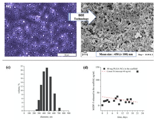 Images of emulsion and derived PLGA-NCs obtained by SEE technology, particle size distribution, and hGDF-5 release profiles within the 3D environment. Optical microscope image of emulsion (a) and electronic microscope image (b) of carriers obtained after emulsion processing by SEE technology; size distribution data of PLGA carriers expressed as volume percentage (c); in vitro hGDF-5 release profile (ng/mL/day) monitored at 37 °C and 100 rpm by ELISA-based assay from 80 mg of carriers, as loaded in each construct (d); n = 2.