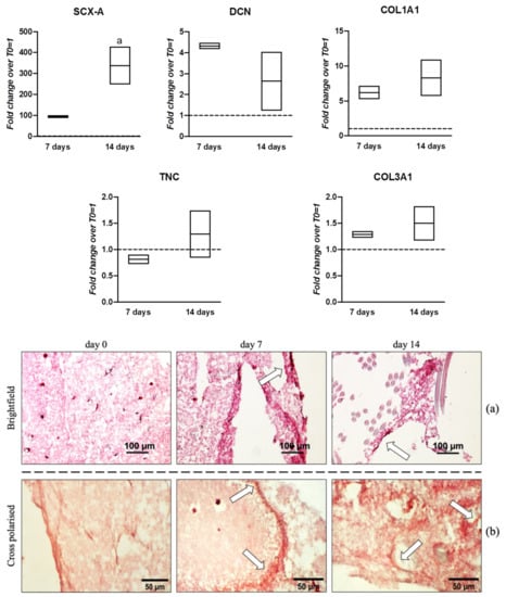 Gene expression profiles for tenogenic markers and histological characterization of hWJ-MSCs cultured within 3D construct functionalized with PLGA-NCs for hGDF-5 controlled delivery under cyclic strain. hWJ-MSCs were cultured into the 3D microenvironment for up to 14 days. The mRNA levels of different tenogenic markers (COL1A1, SCX-A, DCN, TNC, and COL3A1) were monitored. Relative quantification of each mRNA gene expression normalized to endogenous GAPDH (internal control) was calculated using the 2−ΔΔCt method and presented as fold change over hWJ-MSCs T0 = 1 (dashed line). Statistically significant differences are shown as “a” = p ≤ 0.05 compared to T0; n = 2 (biological replicates). Samples at same time-points were subjected to Sirius Red staining for collagen highlighting. The homogenous network of synthetic fibrin matrix appeared progressively filled with new areas of matrix stained in darker red suggesting collagen deposition (arrowheads, a). Polarized microscope revealed larger areas of birefringent collagen fibers (arrowheads, b).