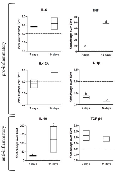 Gene expression profiles for cytokines by hWJ-MSCs cultured within scaffold assembled with PLGA-NCs for hGDF-5 controlled delivery. The mRNA levels of different pro-inflammatory (IL-6, TNF, IL-12A, IL-1β) and anti-inflammatory (IL-10, TGF-β1) cytokines were monitored. Relative quantification of each mRNA gene expression normalized to endogenous GAPDH (internal control) was calculated using the 2−ΔΔCt method and presented as fold change over hWJ-MSCs T0 = 1 (dashed line). Statistically significant differences are shown as “b” = p ≤ 0.001; “c” = p ≤ 0.005; “d” = p ≤ 0.001; compared to T0; n = 2 (biological replicates). The overexpression of pro-inflammatory factors (IL-6, TNF) was significant, together with the upregulation of anti-inflammatory ones (IL-10, TGFβ1).