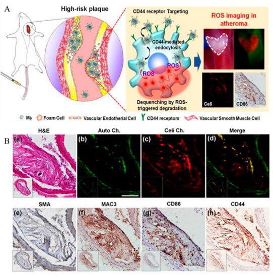 ROS-sensitive photodynamic therapy agents can be designed as innovative theranostic platforms for target imaging and atherosclerosis therapy. Hyaluronic acid, an anionic polysaccharide, is one of the representative biomaterials used as a cleavable substrate for selective ROS detection [110,111]. Kim et al. synthesized MacTNPs by conjugating photosensitizer chlorin e6 to HA [112]. The fluorescence of MacTNPs is inhibited in the native state because of the self-quenching effect of conjugated chlorin e6. However, when MacTNPs are internalized into macrophages, the excess ROS cleaves the chemical bonds of HA, causing chlorin e6 release and resulting in fluorescence emission [112]. This ROS-activatable photosensitizing agent has a high target-to-background ratio and minimal side effects, implying its great potential in NIRF imaging and photodynamic atherosclerosis therapy.