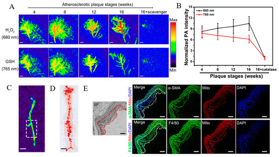(A) PA imaging of atherosclerotic plaques in ApoE−/− mice injected with BSA-Cy-Mito at the indicated stages. (B) Normalized PA intensities of plaques at different stages. (C) PA imaging at plaque lesions across the aorta of ApoE−/− mice. (D) En face aortic lesions in Oil red O-stained aorta. (E) Fluorescence microscope images of aortic plaques in ApoE−/− mice. Scale bar = 100 μm. Adapted from [114].