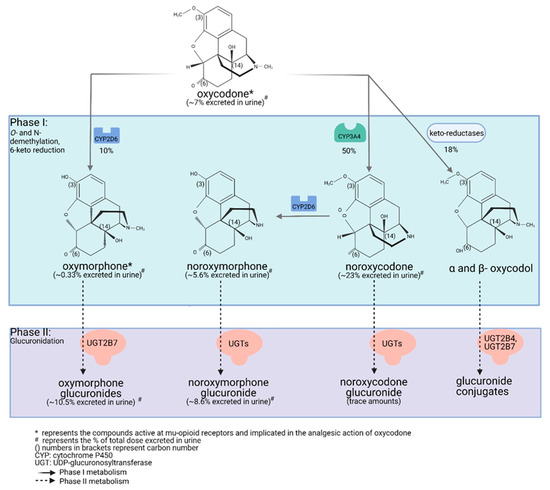 Detailed illustration of the elimination pathways of oxycodone. Created with Biorender.com (access date: 10 May 2021).