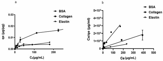 Among adsorption kinetic mathematical models, the low R2 values calculated in the pseudo-first-order model (0.35–0.82), with vast difference between estimated qe and experimental qt (Table 2), discarded this model for describing adsorption phenomena on the rGO surface. However, the pseudo-second-order model showed high R2 values (0.93–0.99) and convergence between the estimated qe and the experimental qt values (Table 2); therefore, this model can be considered the best kinetic model to define the studied protein adsorption phenomena on the rGO surface [58,59]. Interestingly, pseudo-second-order constant K2 reduced while hydrophilicity increased with the lowest K2 for elastin (2.16·µg−1·in−1) and with the highest for collagen (27.27 µg·µg−1·min−1). Representing qt values versus time, while a linear pseudo-second-order plot was more suitable for collagen and BSA (Figure 2c), a nonlinear pseudo-second-order plot was fit for elastin adsorption (Figure 2d) [60]. Collagen showed a ten-fold higher adsorption rate constant (K2) than BSA and elastin, indicating the highest affinity for rGO than elastin or BSA and due to the strong hydrophobic–hydrophobic interactions between rGO surface and collagen [61].