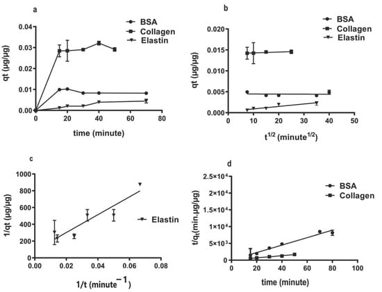 Kinetic protein adsorption models on rGO surface. (a) Adsorption capacity over time; (b) intra-particle diffusion model plot; (c) pseudo-second-order model plot for BSA and collagen; (d) nonlinear plot of pseudo-second-order for elastin.