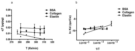 (a) Influence of temperature on the adsorption of proteins. Where mixtures of 250 µg/mL rGO were suspended either in 50 µg/mL BSA, 200 µg/mL collagen, or 50 µg/mL elastin solution and incubated for 2 h at the following temperatures: 5, 10, 15, 25, 37, and 39 °C. (b) Van’t Hoff linear plot of ln Kd against 1/T for proteins adsorption on rGO. ΔH° was estimated from the slope (= −ΔH°/R) and ΔS° from the y-intercept (= +ΔS°/R).
