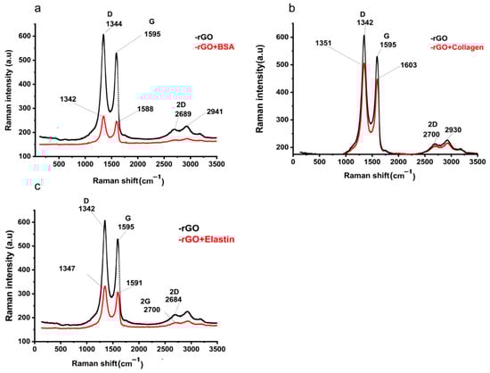 Raman spectra of rGO before and after the adsorption of (a) BSA (rGO + BSA), (b) collagen (rGO + collagen), and (c) elastin (rGO + elastin).