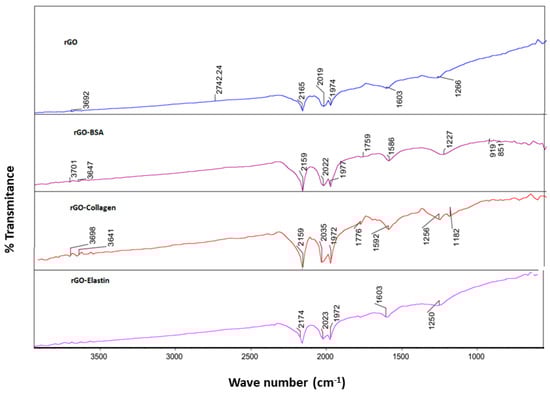 FT-IR spectra of rGO before and after the adsorption of BSA (rGO-BSA), collagen (rGO-collagen), and elastin (rGO-elastin).