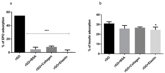 (a) Erythropoietin (EPO) and (b) insulin adsorption on rGO and rGO-protein matrix. Note: *: p < 0.05, ***: p < 0.001, compared to rGO without protein coating.