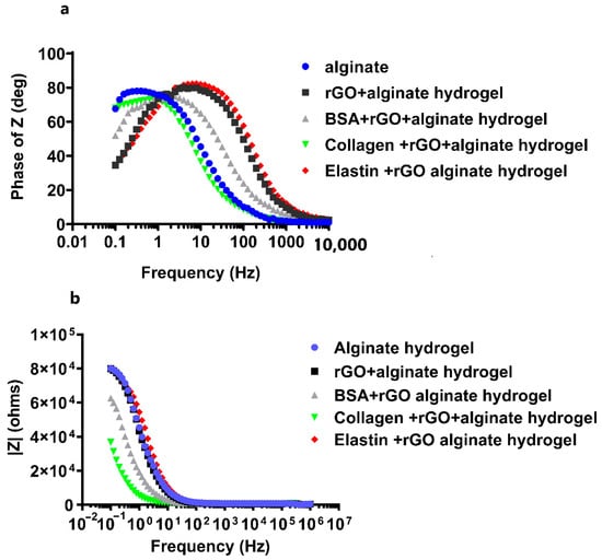 Electrochemical impedance spectroscopy (EIS) measurements for pristine alginate hydrogel, and hybrid alginate hydrogels containing protein-coated rGOs (rGO-BSA, rGO-Collagen, and rGO-Elastin). Bode plots representing (a) phase angle Z vs. frequency, and (b) the impedance modulus |Z| (ohms) vs. frequency. Measurements were performed in 0.1 M PBS buffer at room temperature.