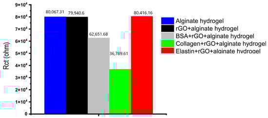 The charge transfer resistance, as seen in Figure 7b, has the largest variance, where alginate hydrogels showed the highest impedance value, decreasing when rGO or protein-rGO was introduced into the hydrogels, especially with collagen that showed the lowest impedance value. At low frequencies, the charge transfer resistance can be obtained by interpolating the semi-circle to the real x-axis [73]. The current density of the rGO-proteins alginate hydrogels rises as the hydrogel resistance and charge transfer resistance fall [73]. Figure 8 depicts the charge transfer resistance (Rct) derived by analyzing the EIS spectra. Because the charge transfer resistance characterizes the electron flow at the counter electrode to a great extent, the lower the resistance, the faster the electron flow rate in the hydrogel [73].
