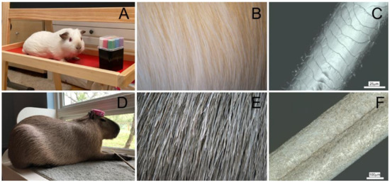 American breed guinea pig C. porcellus (A) is covered by a dense layer of insulating, thin, unwaxed hair (B), while the capybara H. hydrochaeris (D) skin is covered by long, thick, double-curved, and mechanically strong hair (E) aimed to protect the skin from scratches and make it water-resistant. The 3D confocal optical microscopy images of guinea pig (C) and capybara hair (F) demonstrate the fine structure and surface appearance of the hair cuticle.